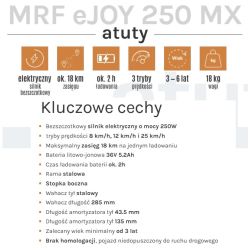 MRF eJOY 250 MX to nie kolejna plastikowa zabawka, ale w pełni funkcjonalny elektryczny motocykl, stworzony dla dzieci już od 3. roku życia. Zaprojektowany z dbałością o każdy detal, oferuje technologię inspirowaną prawdziwymi motocyklami terenowymi, w wersji dopasowanej do potrzeb i możliwości najmłodszych riderów. To konstrukcja, która łączy solidność i wytrzymałość z przemyślaną ergonomią, oferując dzieciom nie tylko świetną zabawę, ale też komfort, kontrolę i poczucie bezpieczeństwa. MRF eJOY 250 MX wyróżnia się w swojej klasie dzięki jakości wykonania, która nawiązuje do modeli dla dorosłych, oraz rozwiązaniom dostosowanym do wieku i etapu rozwoju dziecka. To motocykl, który pozwala rozpocząć prawdziwą przygodę na dwóch kółkach – od pierwszych śladów po coraz odważniejsze trasy.